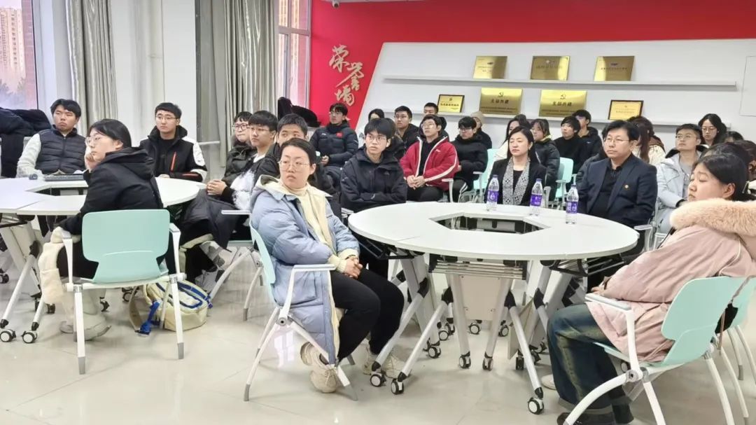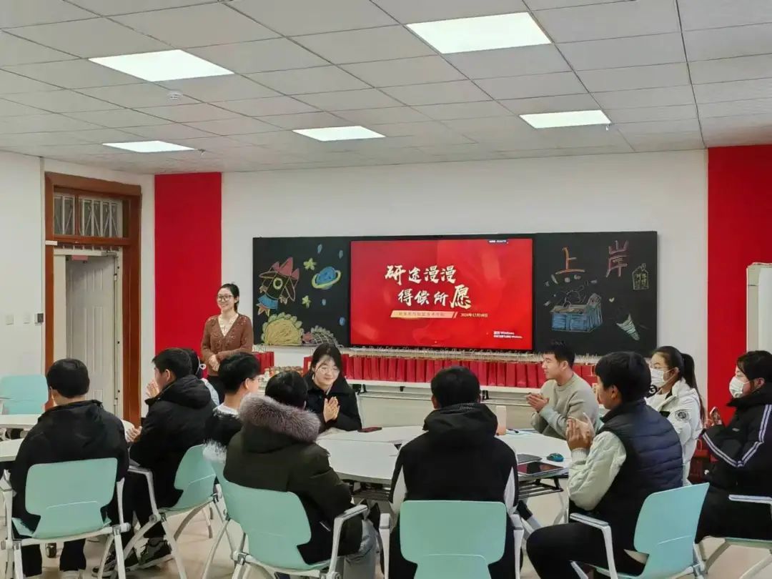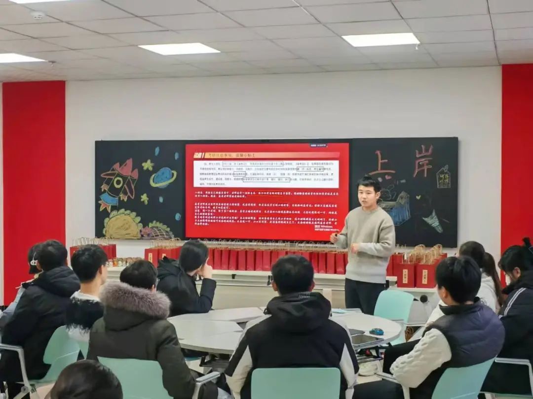 活动现场气氛热烈,本场会议由李双峰老师主持。首先由贾迪老师介绍考研的部分要求,并用自身考研经历与同学交流,分享经验。接下来放映由学院团委组织并满载着对同学们对学长学姐们的祝福视频。随后,由党委书记任艳秋进行致辞,书记首先表达了对考研学子的理解与支持详细询问同学们的学习生活,鼓励他们要勤奋拼搏、志向远大,为实现人生目标而努力;并提醒同学们要劳逸结合,保持最佳状态;祝愿同学们都能取得理想的成绩,开启人生新篇章。