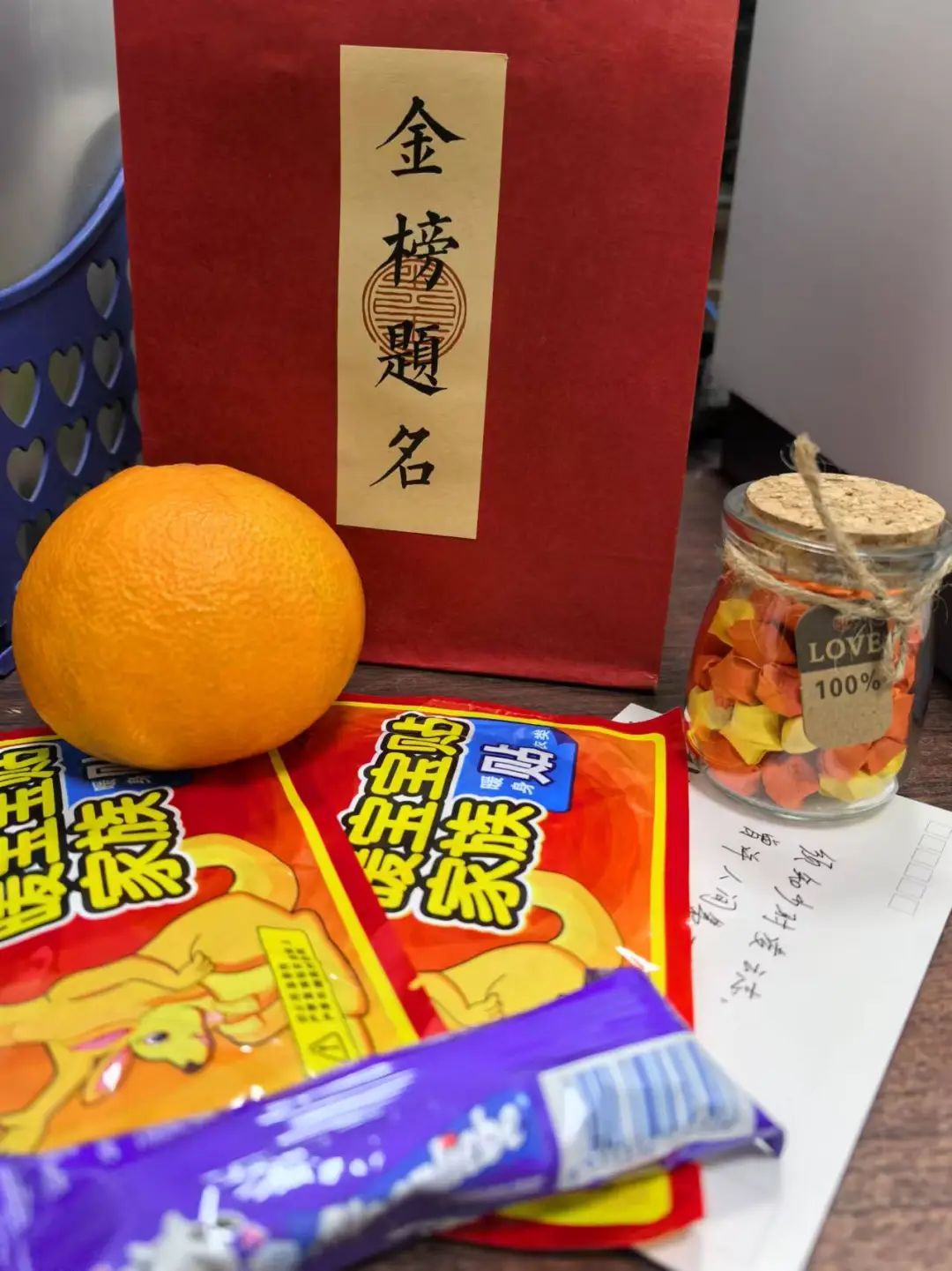 考研礼包中每一份礼物都代表了一份期待,寄托着学院对考研学生的关心与祝福;一颗硕大饱满的橙子,祝愿考研学生心想事“橙”;一个甜甜的棒棒糖祝愿考研学生取得优异成绩,金榜题名;两片暖宝宝,希望在寒冷的冬天也可以感受到来自学院的温暖;一张明信片,寄托着全院教师、学弟学妹们的共同祝福,愿考研学子能够”研“途漫漫,得偿所愿,一战成“硕”。