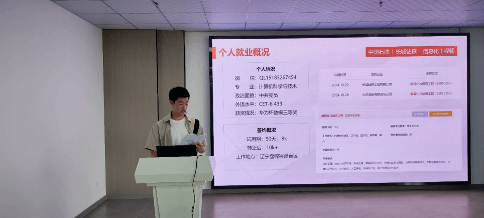 3名签约“三桶油”的毕业生结合自身求职经历,从不同角度展开分享。签约中国石油集团长城钻探工程有限公司的王启龙和签约大庆油田有限责任公司的闫凯,建议尽早关注三桶油官网和招聘公众号,针对性提升专业能力,提示从投递简历到录用各环节的注意事项。李琪签约中国石油天然气股份有限公司大庆石化分公司,选择留庆留省就业,她建议要考虑行业前景而非仅看起薪,同时要结合个人兴趣和专业技能。